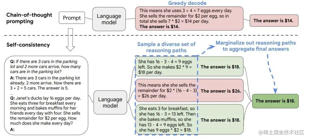 核心思想就是少数服从多数,多让模型回答几次(这里的提问也用到了少样本思维链),然后在 LLM 的多次回答中选择出现多次的答案。