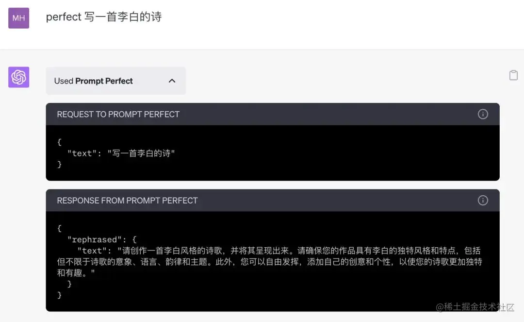 目前网上已经有不少 prompt 优化工具,比如 chatgpt 的插件中就有一个不错的工具 prompt perfect,能够基于用户给的 prompt 进行优化,再喂给 chatgpt 进行提问