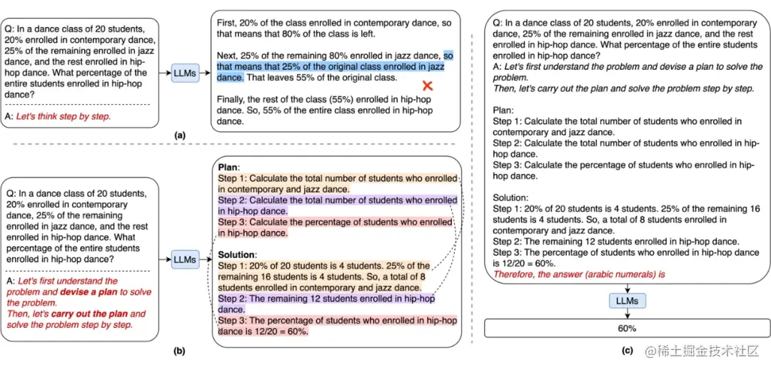 少样本思维链:就是用户提供一些“解题步骤”,比如下图所示,左侧直接让 LLM 回答问题时它给出了错误的答案,但是右侧通过在 prompt 中告诉模型解答步骤,最终给出的答案就是准确的。