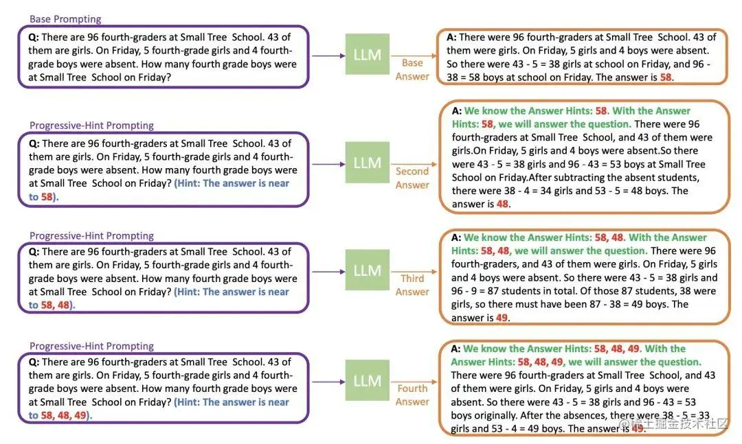 在 PHP 方法中,首次与 LLM 交互使用的 prompt 称为基础提示(Base Prompting)。基础提示可以是标准提示、CoT 提示或者其他改进版本的提示。在随后的交互中,将使用 PHP 提示,直到最新的两个答案一致。