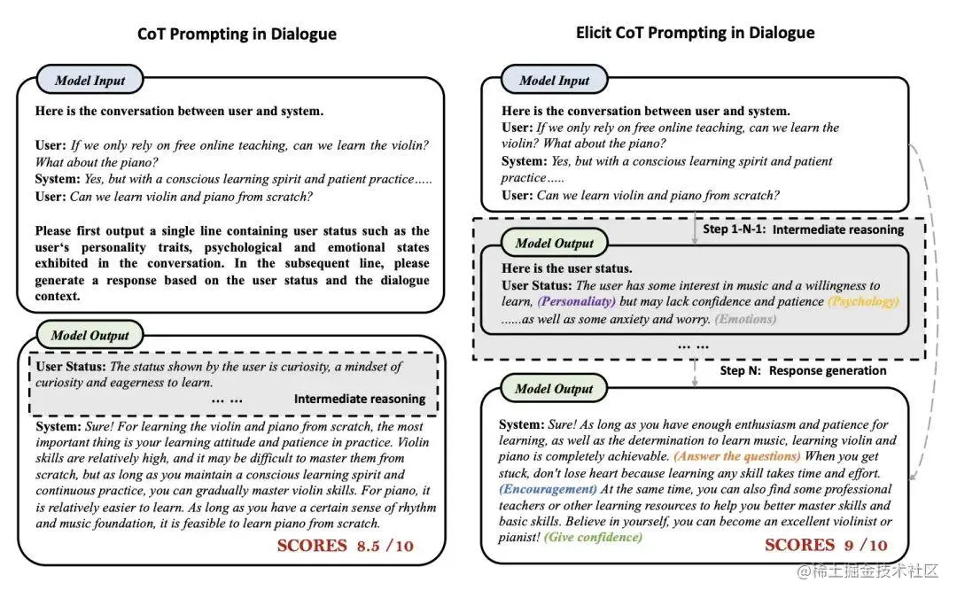 这个工作的主要目的是让 LLM 在对话时考虑用户的状态,比如用户的 personality, empathy, 和 psychological,遵循的还是思维链的套路,并且将思维链拆成了多个步骤(LLM 每次回答一点,不是一次性基于思维链全部回答)。这样的好处在于用户还可以修改、删除中间过程的一些回答,原始的上下文和所有中间过程都会用于最终回答的生成。