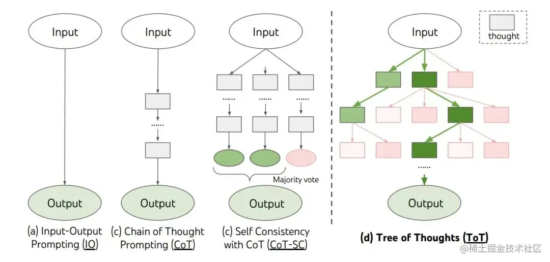ToT 将问题建模为树状搜索过程,包括四个步骤:问题分解、想法生成,状态评价以及搜索算法的选择。