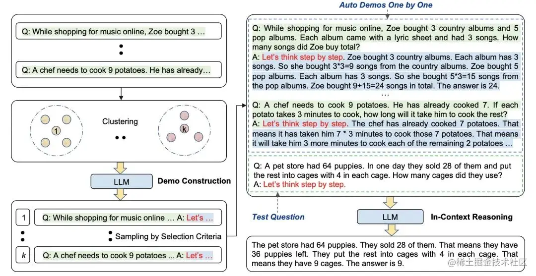 然而过于简化的方法肯定也会存在一定局限性,比如 LLM 可能给出的是错误的思考过程。因此有了自动化思维链,通过采用不同的问题得到一些推理过程让 LLM 参考。它的核心思想分两步