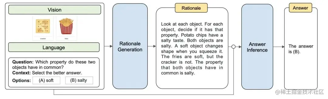 - 理由生成:在这个阶段,我们将语言和视觉输入提供给模型,以生成推理的理由。这个理由可以看作是解决问题的中间步骤或思考链的一部分。这个过程可以帮助模型理解问题的上下文,并为下一步的答案推断做好准备。