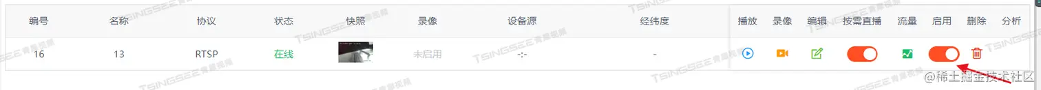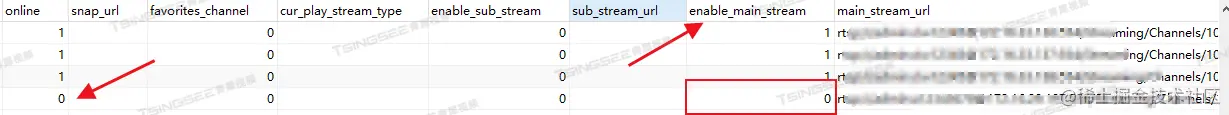 分析:enable_main_stream字段是主码流开启字段,正常情况下,添加设备/通道会默认主码流或者子码流处于开启状态。上述的用户项目现场是迁移数据库,因为迁移没有对应的字段数据库,所以默认都给了关闭状态,导致该通道无法使用RTSP地址进行拉流,所以一直处于离线状态,将enable_main_stream默认等于1即可解决。