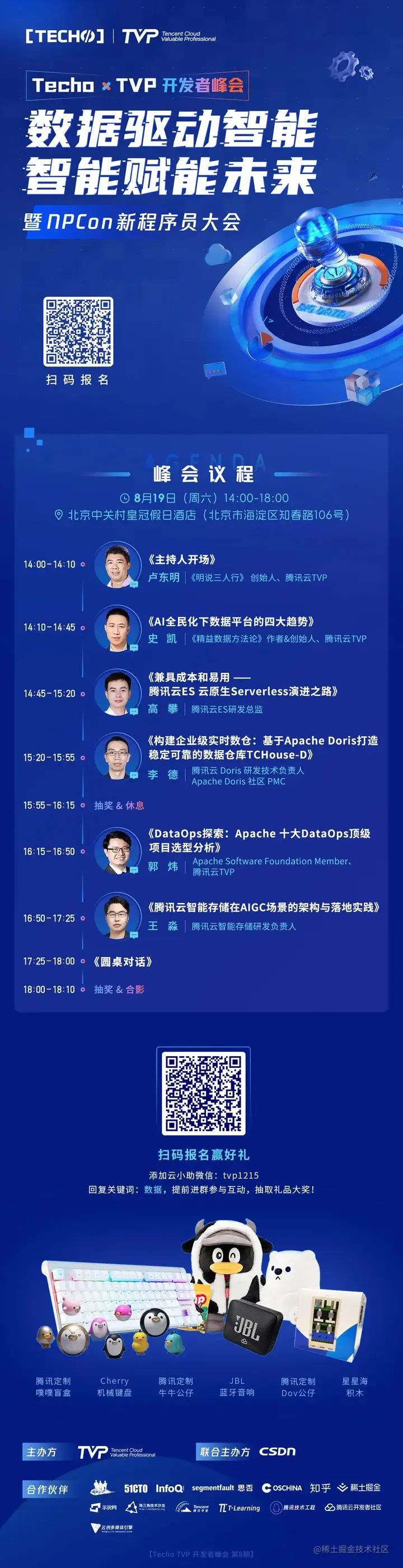 大会现场更有 Cherry 机械键盘、JBL 蓝牙音响、腾讯定制噗噗盲盒、鹅厂周边公仔等精美礼物,所有到场参会的开发者皆有机会参与抽奖。你还在等什么,快扫码报名参会吧!报名成功后,添加云小助微信:tvp1215,回复关键词:数据,可提前进群参与互动,抽取礼品大奖!