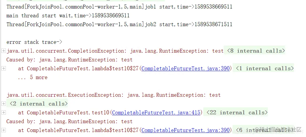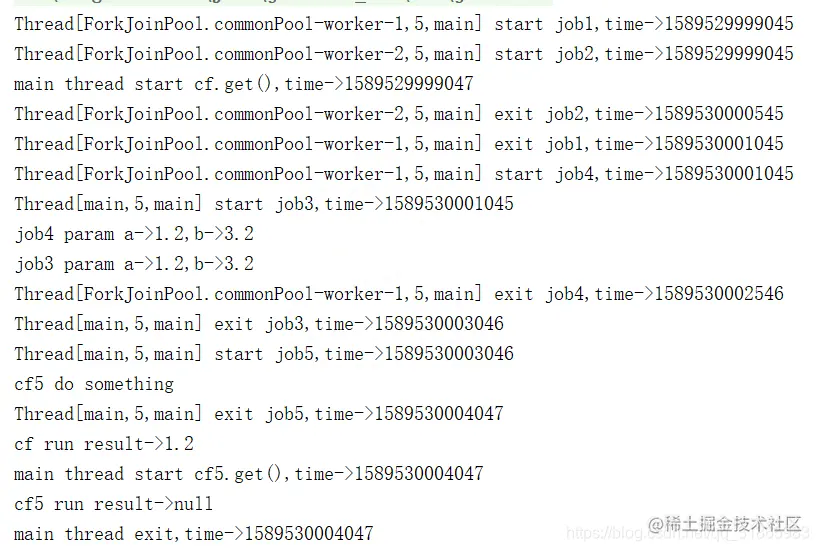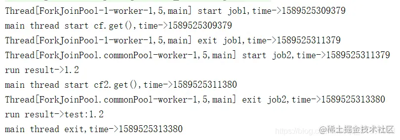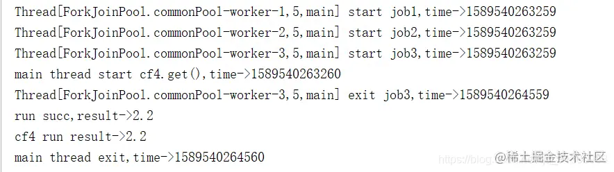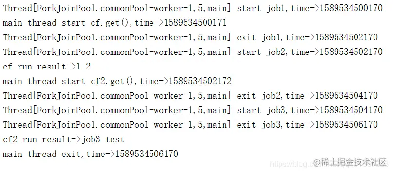 cf2没有指定,其result就是cf执行的结果,理论上cf2.get应该立即返回的,此处是等待了cf3,即job2执行完成后才返回,具体原因且待下篇源码分析时再做探讨。