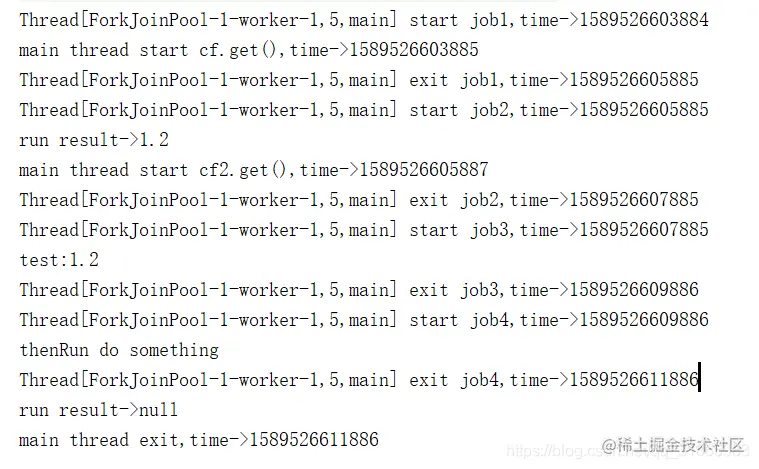 thenApplyAsync与thenApply的区别在于,前者是将job2提交到线程池中异步执行,实际执行job2的线程可能是另外一个线程,后者是由执行job1的线程立即执行job2,即两个job都是同一个线程执行的。将上述测试用例中thenApply改成thenApplyAsync后,执行结果如下: