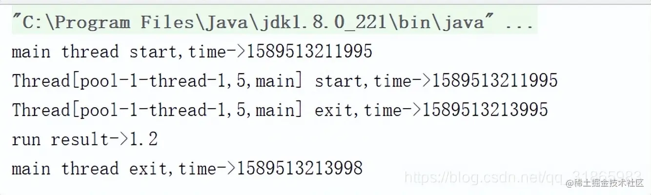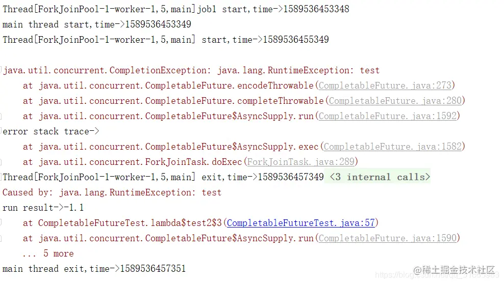 很多博客说使用不带等待时间限制的get方法时,如果子线程执行异常了会导致主线程长期阻塞,这其实是错误的,子线程执行异常时其异常会被捕获,然后修改任务的状态为异常结束并唤醒等待的主线程,get方法判断任务状态发生变更,就终止等待了,并抛出异常。将上述用例中if(false)改成if(true) ,执行结果如下: