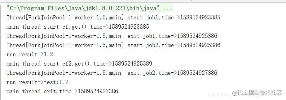 从输出可知,执行job1和job2是两个不同的线程。thenApplyAsync有一个重载版本,可以指定执行异步任务的Executor实现,如果不指定,默认使用ForkJoinPool.commonPool()。