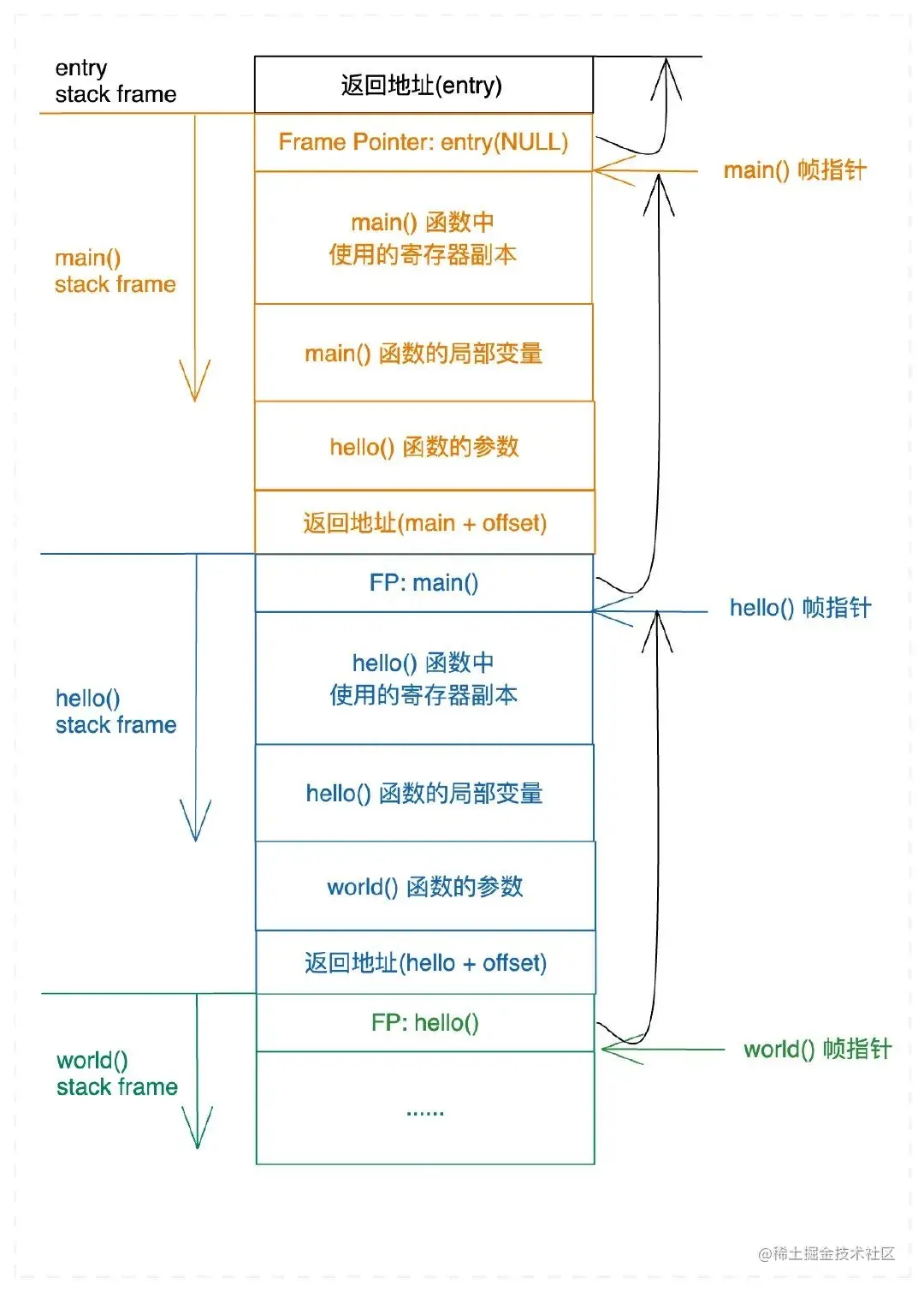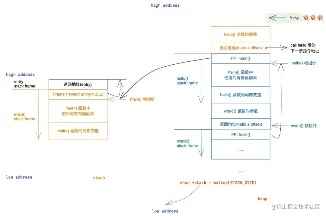 这样我们的栈帧就不是连续的了,main 的栈帧在栈上,hello 的栈帧在堆上。但其实这是没有影响的,只需要能够维护好栈帧的链式关系就可以了。在进入 hello 时,和之前一样会保存好 main 的 rbp,因此我们不需要额外关注链式结构。