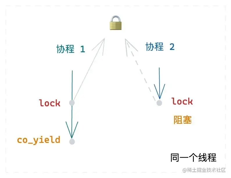 可以很好的解决这里的问题,协程 1 持有了锁,主动让出 CPU,协程 2 尝试获取锁,肯定获取不到,就会主动 yield,协程 1 继续执行,执行完后,释放锁,协程 2 就可以获取得到锁,继续执行。