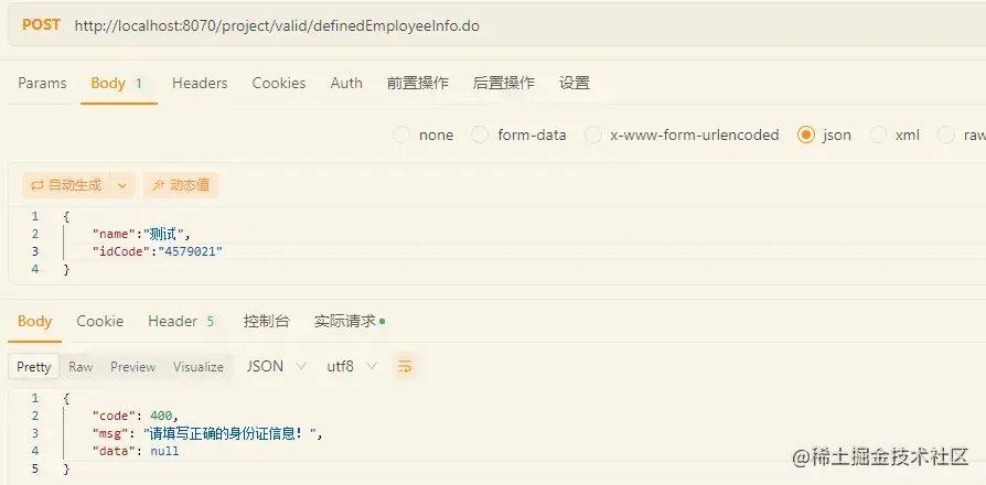 输入了错误的身份证,则校验不通过,提示定义的信息。
