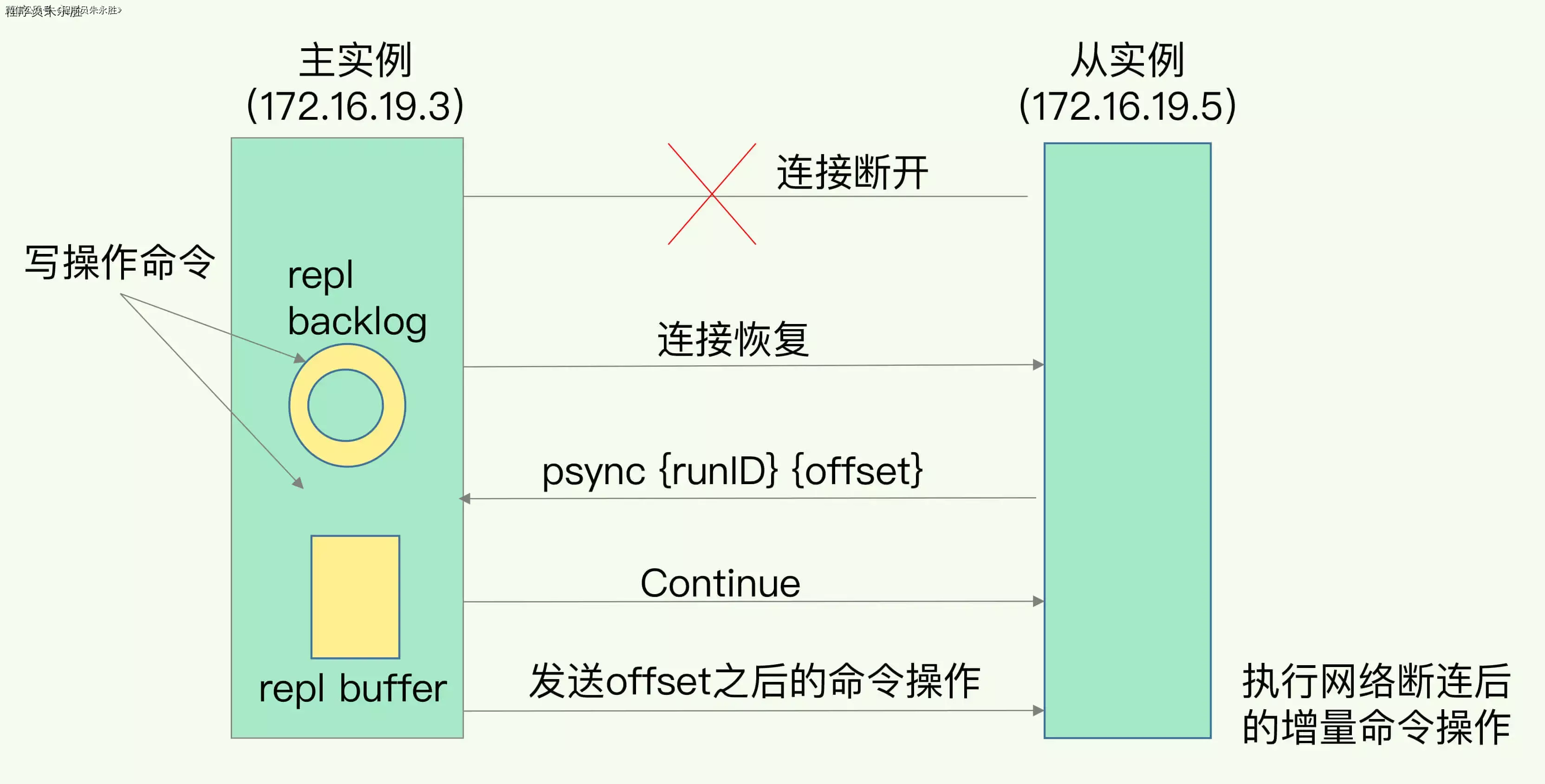 - 部分复制(增量同步): 如果是增量同步,主服务器会从记录的偏移量处开始,将从偏移量后的所有更新数据发送给从服务器。这样从服务器就能够获取在断开网络期间主服务器的更新数据。
