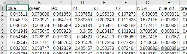 df进行多个条件的筛选操作,使用了逻辑运算符&和比较运算符进行条件组合。例如,其中的第一行df["inf"] >= -0.2和df["inf"] <= 18就表示筛选出"inf"列的值在-0.2到18之间的数据;第二行df["NDVI"] >= -1和df["NDVI"] <= 1则表示筛选出"NDVI"列的值在-1到1之间的数据,以此类推。 - 保存结果数据:使用
