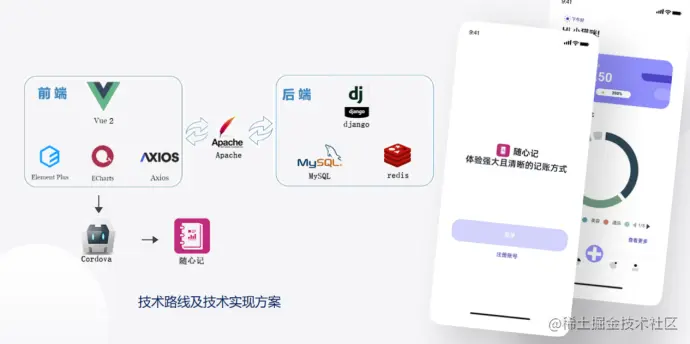 项目使用 H5 移动应用开发模式。其中前端采用渐进式框架 Vue.js。后端采用腾讯云 Ubuntu 操作系统服务器和 MySQL 数据库,并采用安全性高且拓展性强的 Django 框架,最后通过 Cordova 将前端界面转换为 Android webview 上的页面,并对接口进行相关适配。