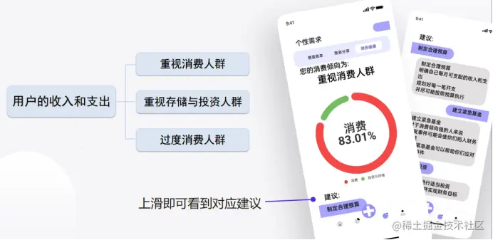 本团队借用平均消费倾向(APC)概念,根据用户在软件中的收支数据,计算其平均消费倾向,分析其消费倾向(重视消费人群,过度消费人群,倾向储蓄与投资人群),并给予相应的可行性较强的建议。
