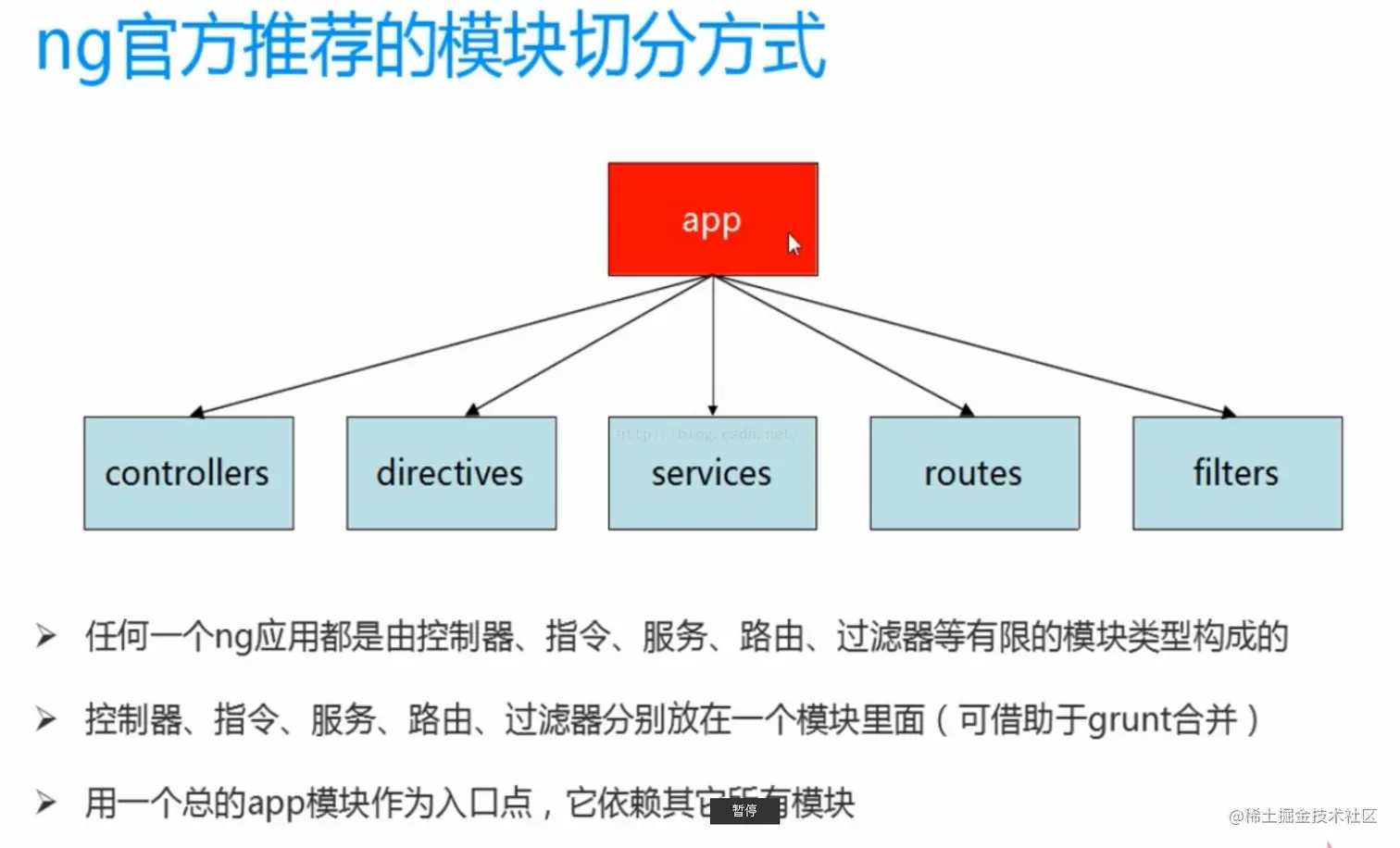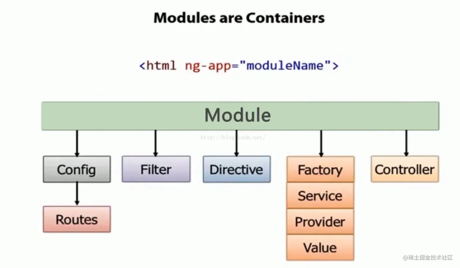 Angularjs的模块化思想:首先创建一个module,其他指令附着其上。如下图所示: