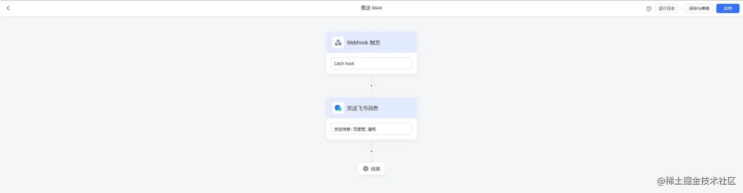我们通过 Webhook 作为流程触发条件,当我们监听脚本发现有新 issue 记录或者回复时就可以通过调用飞书的 webhook 来触发机器人的消息推送流程了