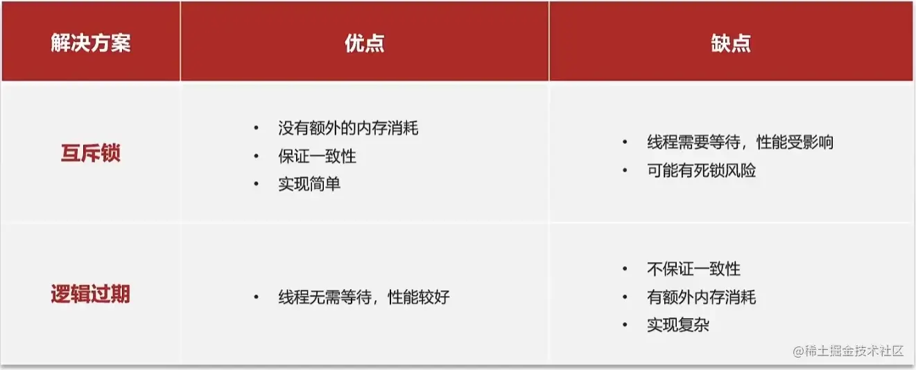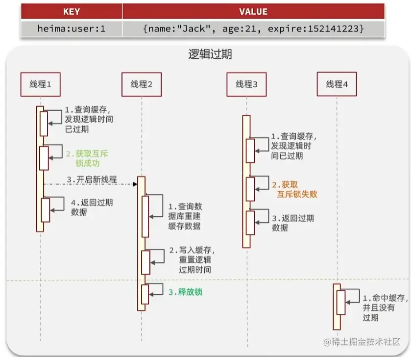 相当于redis中expire为0,永不过期(一般来说这个问题出现在活动业务比较多,如果活动持续一个月,那么过期时间直接设置成一个月或者直接不过期,等待活动结束一并删除)。但是数据中会有个字段控制过期时间,每次拿数据进行一下逻辑判断,如果过期了,就去数据库更新数据。更新数据的过程也用到了锁机制,但是如果获取不到锁,则会直接返回旧的数据而不是等待。