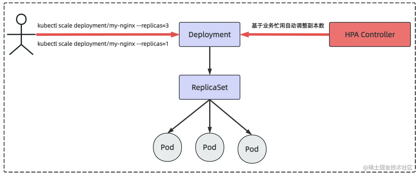 常规场景下,比如晚上业务压力较小情况下,可以使用kubectl scale指令将Pod副本数设置为1;当白天上班高分期业务压力大时使用kubectl scale指令将Pod的副本数设置为3,但这些操作都是人为介入执行的。而HPA控制器则是基于业务的指标判断业务忙闲自动基于算法计算出当前多少Pod副本数运行比较合适,自动调整Pod的副本数。