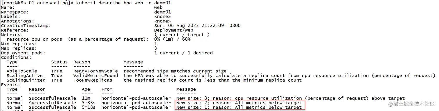 查看hpa描述信息,同样印证了hpa发生缩容: