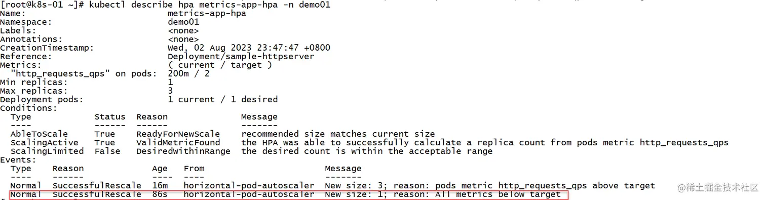 停止接口压测后,hpa指标下降,200m明显小于2,当大概平稳5分钟后,hpa开始进行缩容,将副本数从3降到1:
