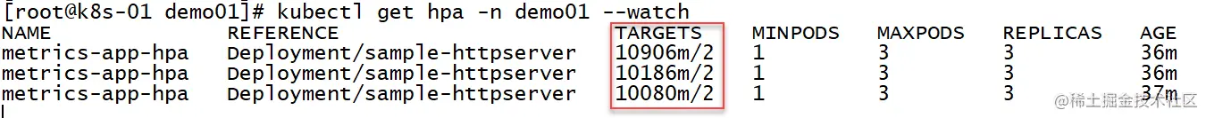 查看hpa状态,targets一栏显示当前指标到达10900m左右,斜杠后面2表示到达2就要弹性伸缩,10900m/1000=10左右,明显超过2,则replicas一栏显示当前进行扩容到最大副本数3: