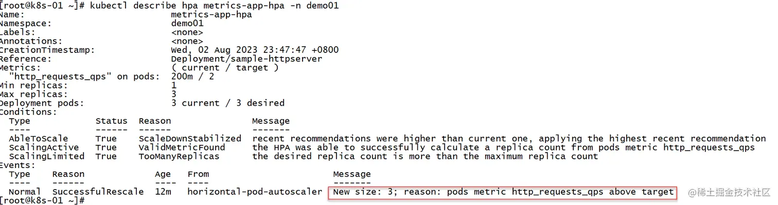 查看hpa描述信息,可以看到有条Event清晰描述出有图http_requests_qps指标超过target设置的2,副本数设置为3: