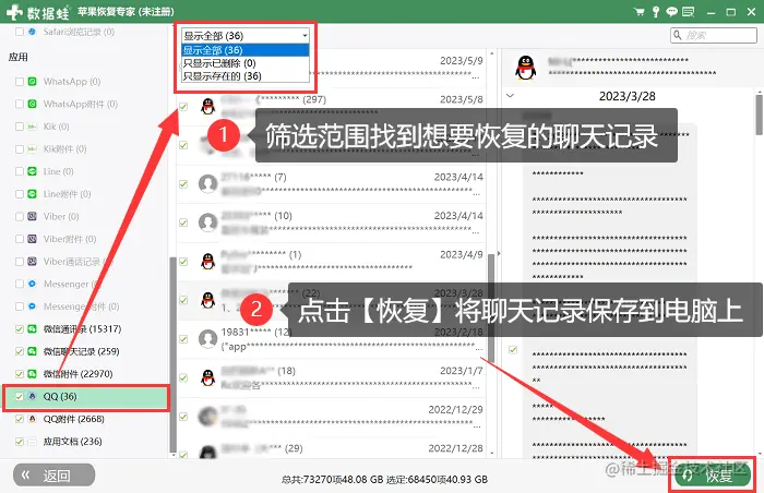 步骤2:待软件提取完备份数据后,跟上述方法二一样,选择好聊天记录后点击【恢复】,然后选择路径保存到电脑上就可以了。