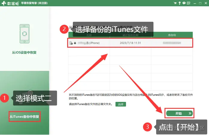 步骤1:返回软件首页,选择第二种模式【从iTunes备份中恢复】,并在列表中选择需要扫描的备份文件,然后点击【开始】。