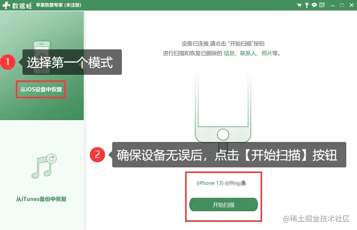 步骤2:安装完毕打开后,我们可以看到有两种恢复模式,使用数据线先把iPhone和电脑连接,然后选择【从iOS设备中恢复】并点击【开始扫描】即可,该模式适合没有进行聊天记录备份的苹果用户。