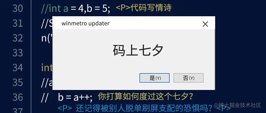 还记得一个月之前我们被首页一篇文章撒🐶粮的小伙伴吗?还记得被别人脱单刷屏支配的恐惧吗?一年一(N)度的中国情人节七夕来了,你打算如何度过这个七夕?来参加掘金社区的七夕活动吧~