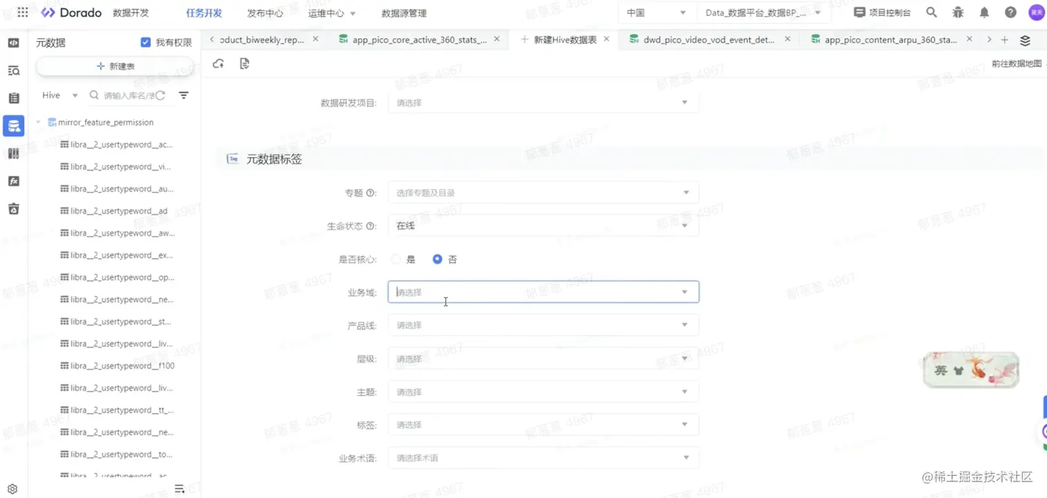 在数仓建表规范中,首先PICO数据团队可通过火山引擎DataLeap的表格管理功能做到快速建表,帮助使用者识别每个字段,及它对应的字段类型,大幅度提升了开发工作效率;同时,完成建表后,可以通过DataLeap再进一步筛选元数据标签,获取如业务域、产品线、层级、主题等相关信息;最终,正式上线前,相关的管理人员会进行交叉review,保证数据使用安全。