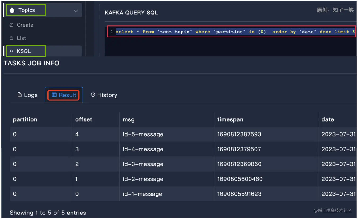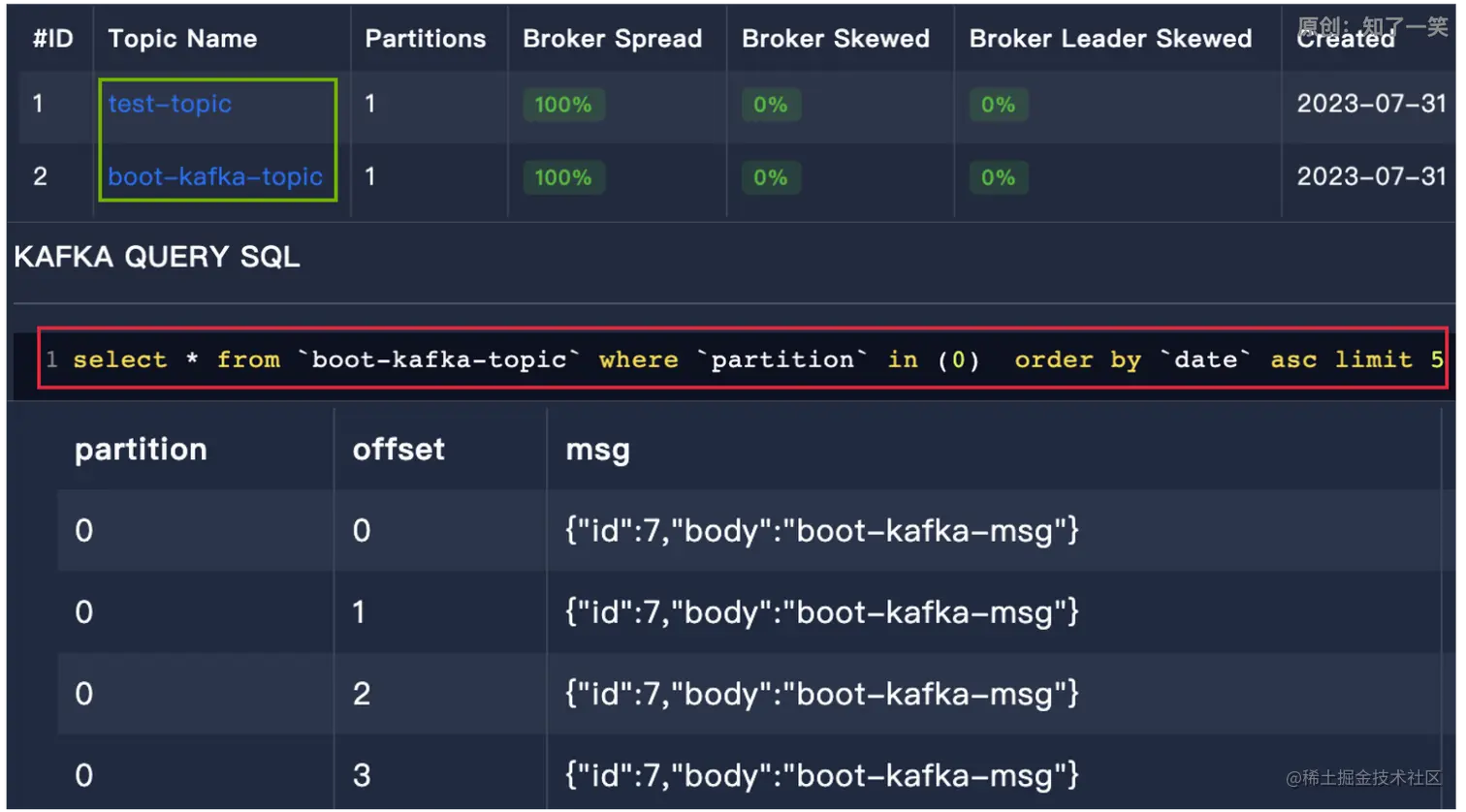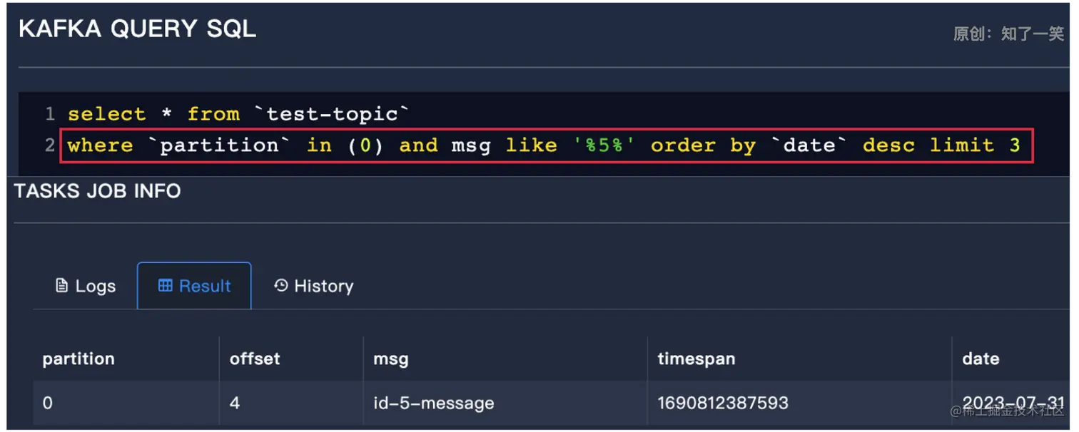 select * from `test-topic` where `partition` in (0) order by `date` desc limit 5