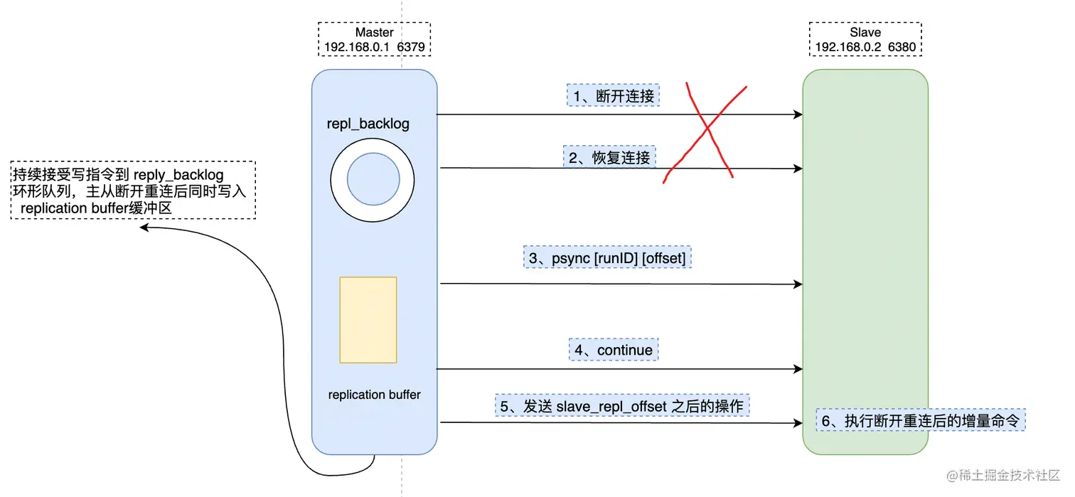 slave_repl_offset,各自复制的进度也不相同。 - 重连主库进行恢复时,从库会通过 psync 命令将 slave_repl_offset 告知主库,主库判断从库的状态,来决定进行增量复制,还是全量复制。