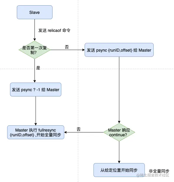 - 如果从实例从未执行过 replicaof ,则从节点发送 psync ? -1,代表全量,从 -1 处开始复制。