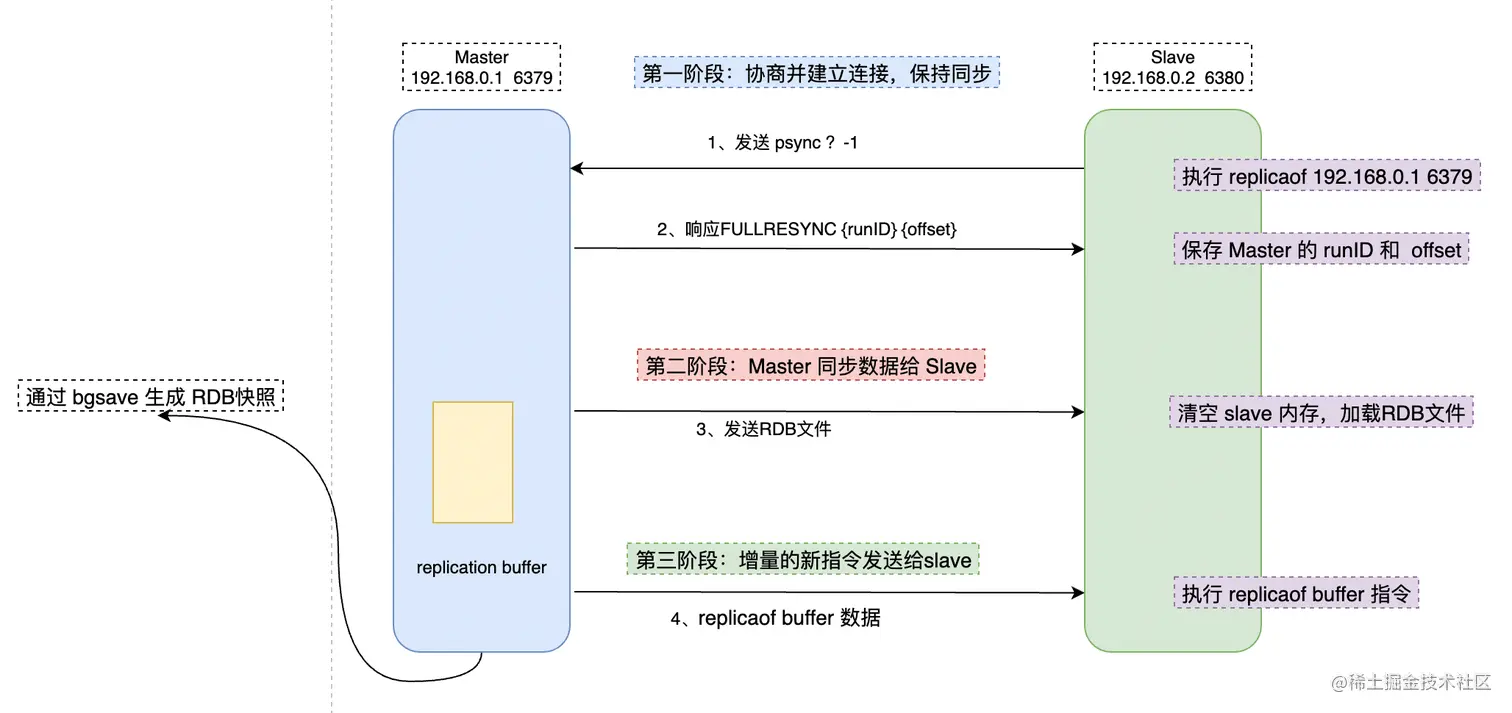 主从库第一次复制过程大体可以分为 3 个阶段:准备阶段(即建立连接准备)、主库同步数据到从库阶段、发送同步期间增量指令到从库的阶段。