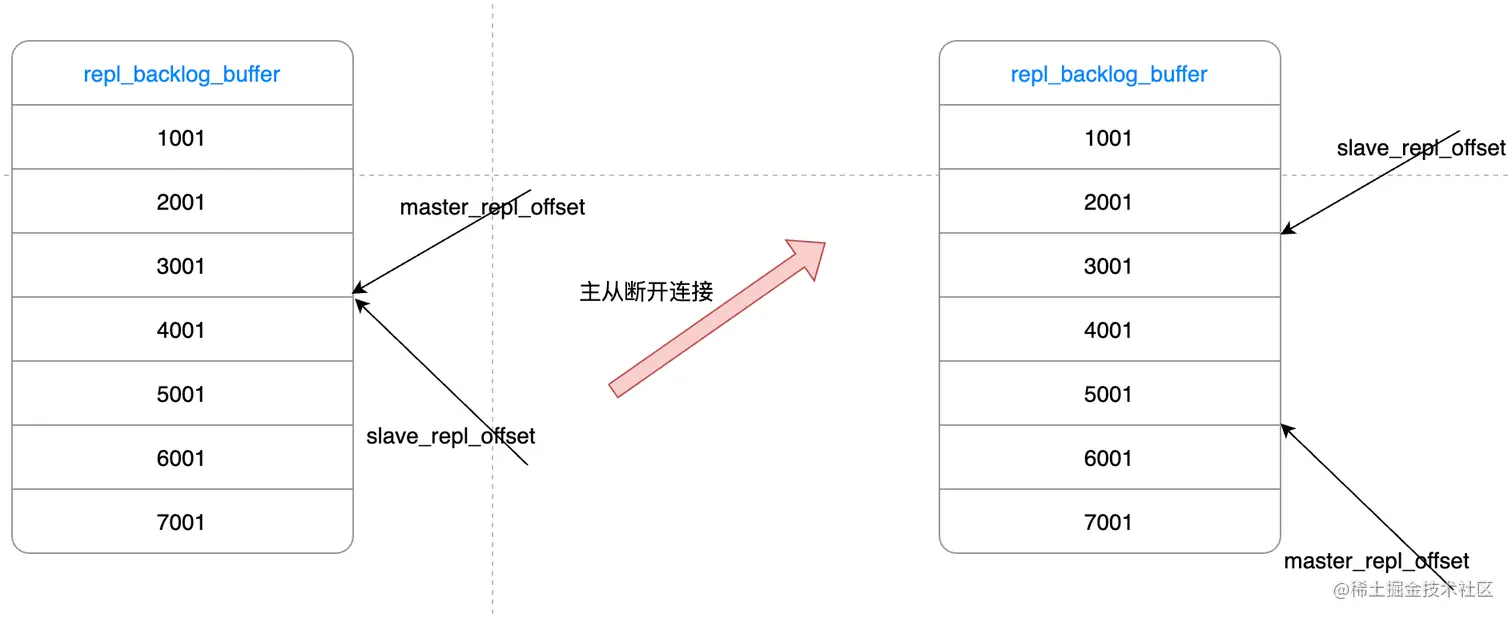 但是网络断开或者从库故障期间,主实例Redis一般会收到新的写操作命令,但从实例则暂停执行,所以 master_repl_offset 会大于 slave_repl_offset。如下图右。