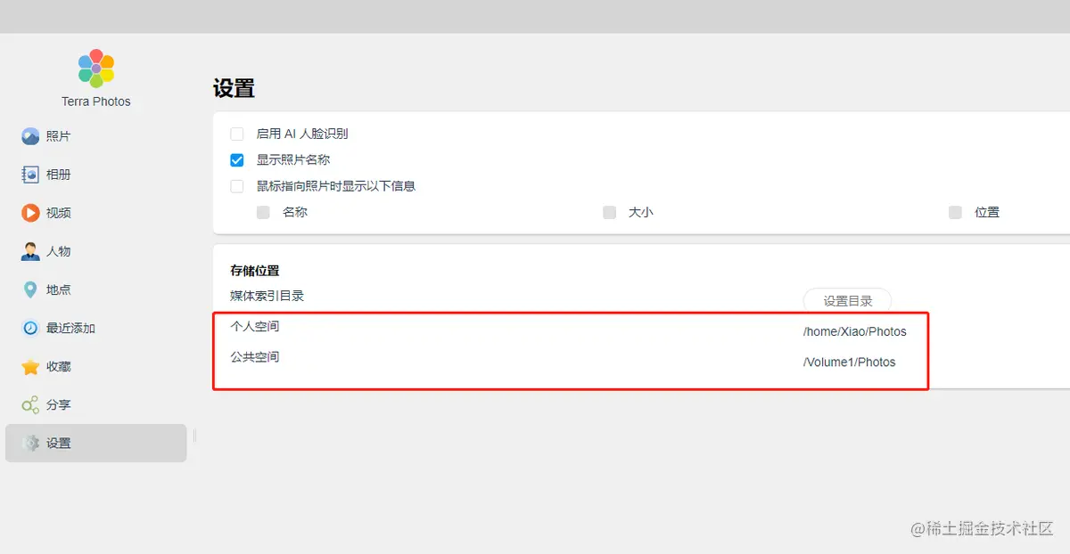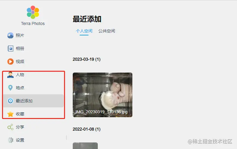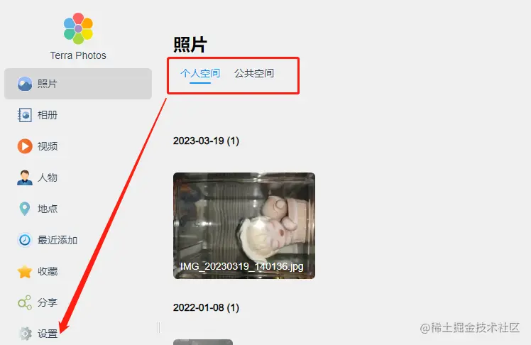 Terra Photo的相册管理分为个人空间和公共空间,分到这两个位置取决于设置中的存储位置;