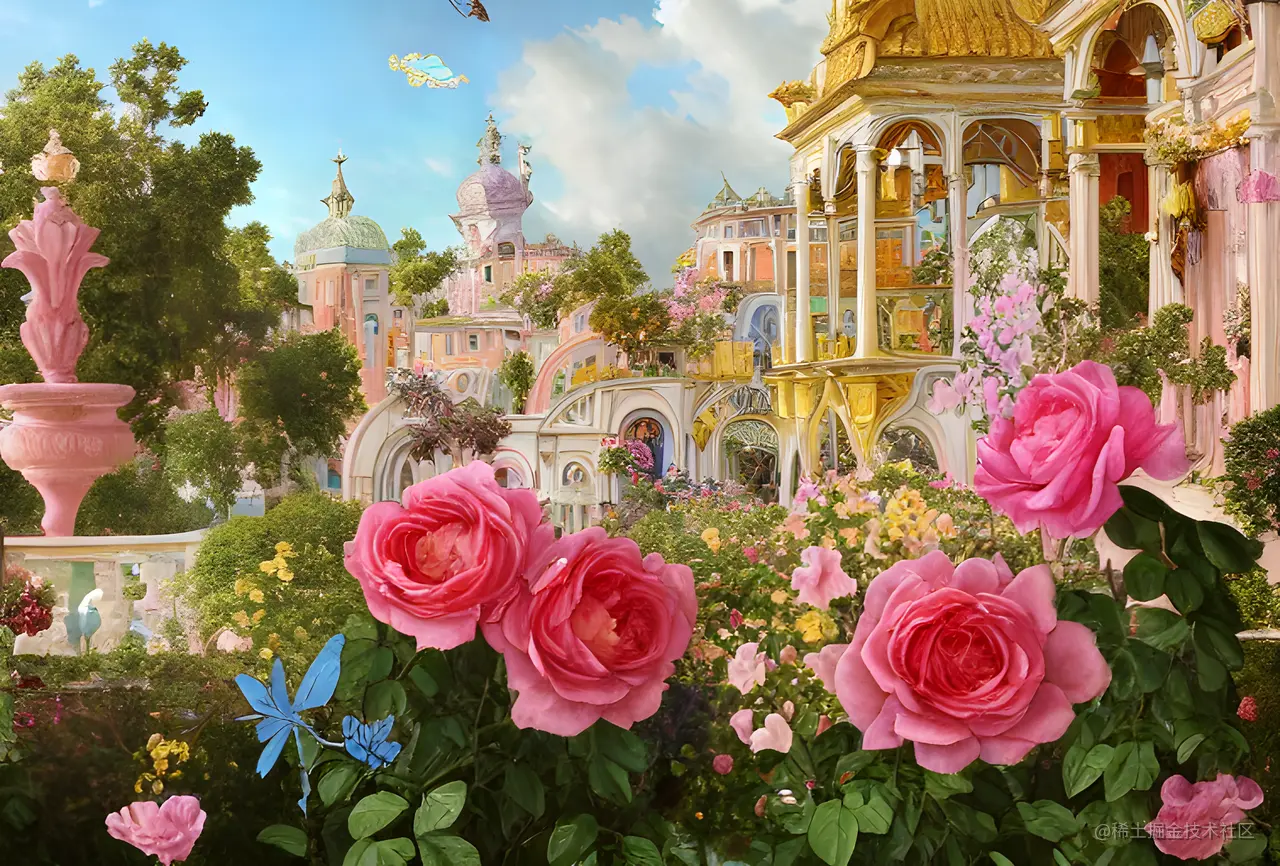 - Prompt: 非常详细的威尼斯洛可可画,描绘了一个郁郁葱葱的花园,满是柔和的粉红玫瑰,没有人,地平线上的金色城堡,蓝色蝴蝶,柔和的华丽背景,体积照明,花卉,幻想,逼真,数字插图,krenz cushart 的艺术,alphonse mucha, kehinde wiley, artem demura , 8k, 高清