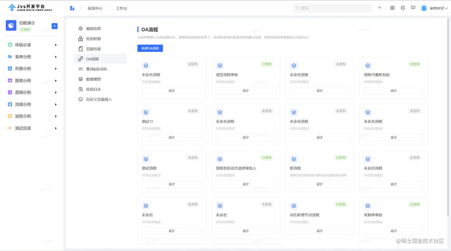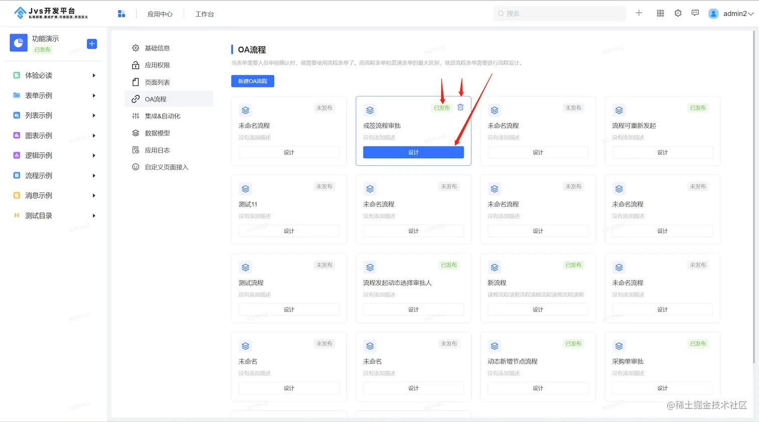 页面可以对创建流程、删除流程、对流程进行设计, 展示流程相关发布状态
