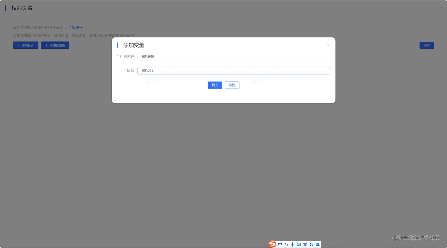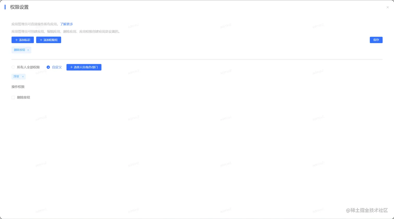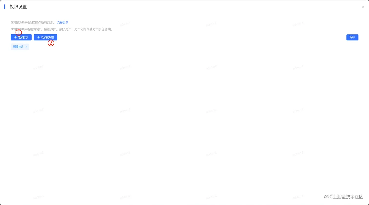 ①:新增权限标识,就是声明一个对应权限的标识,在自定义页面中实现对这个标识 的权限控制,可以添加多个权限标识