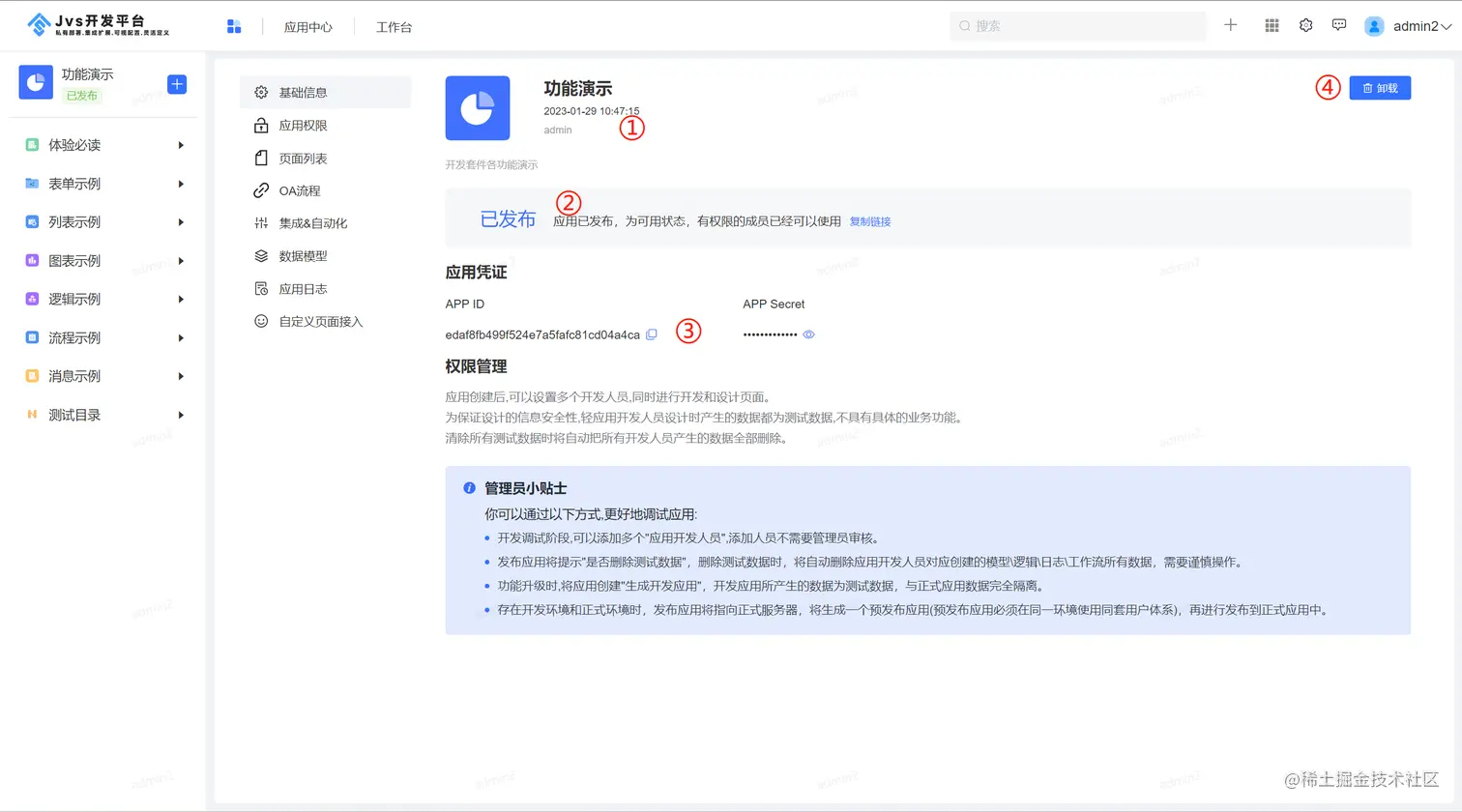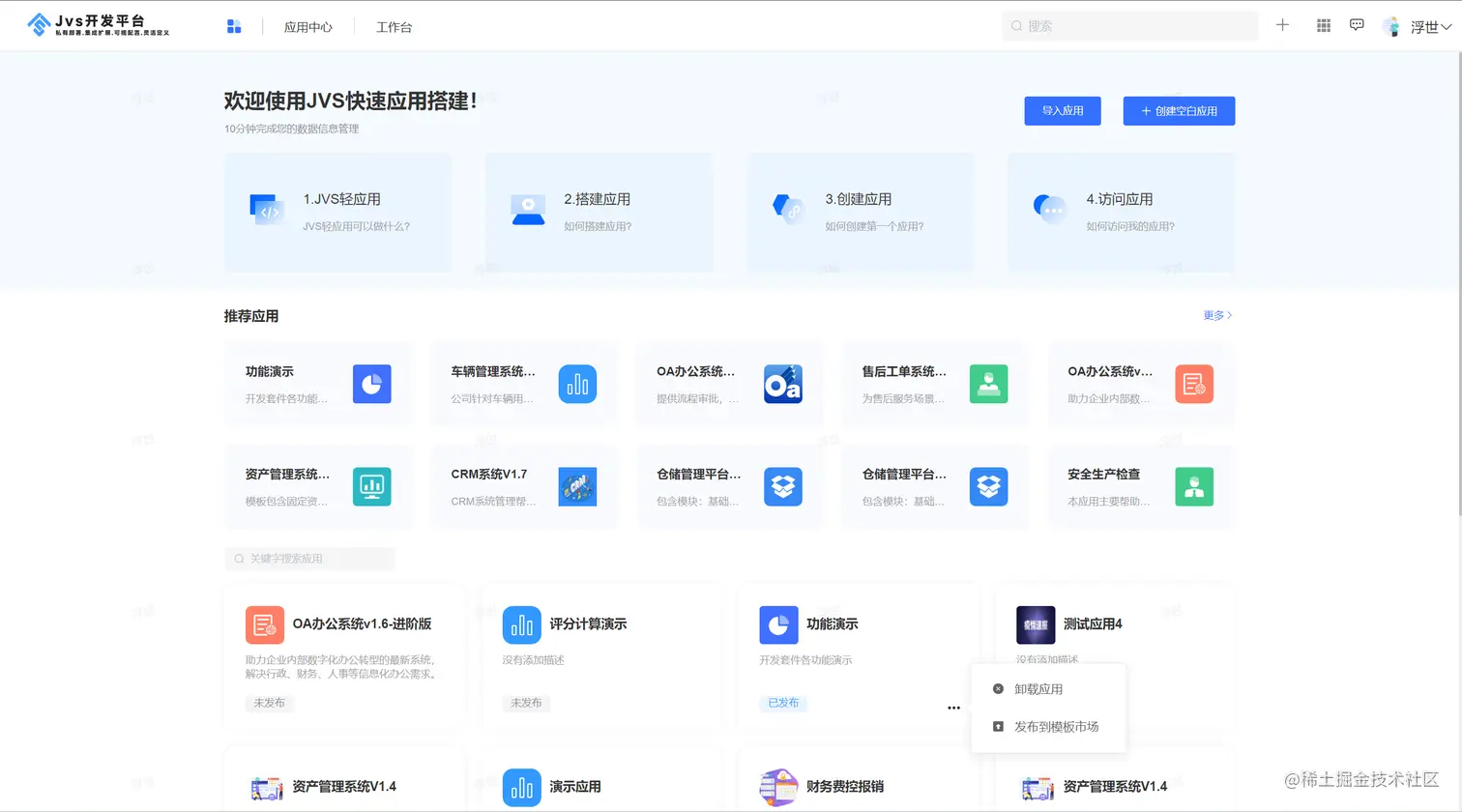 JVS轻应用的详情展示如下图所示,点击应用的名称,右侧展示出应用的基本详情