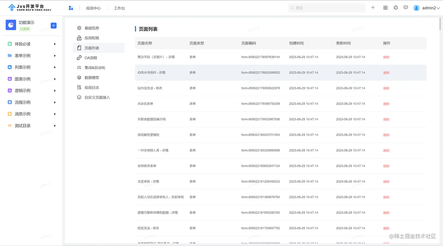 点击页面列表,展示的系统中包含的配置生成的列表页与表单,这里可以对已经配置的页面进行删除操作。