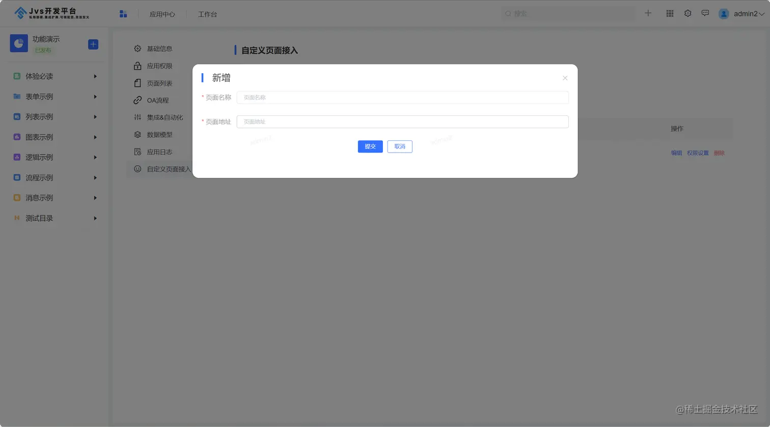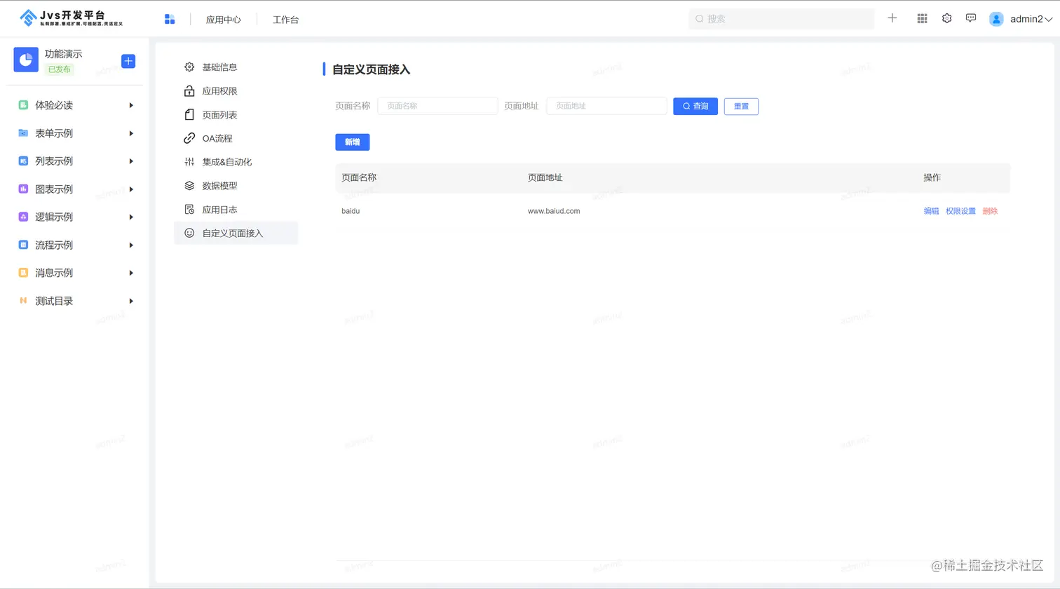 这里自定义页面主要解决自定义的前端页面需要接入轻应用是,需要具备同样的权限控制体系,可以通过声明权限的标识,由自定的页面自己实现界面的权限控制,由轻应用来配置权限分配。