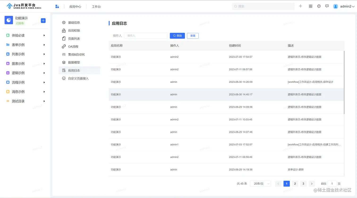 应用日志是记录本应用编辑操作的历史过程,其中记录了操作人员、操作时间,操作的内容,如下图所示
