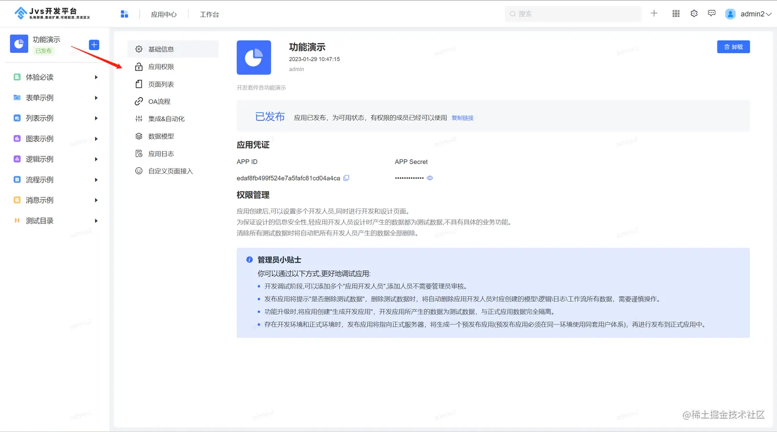 点击应用权限,系统进入应用权限管理页面,提供对本应用的授权配置的操作