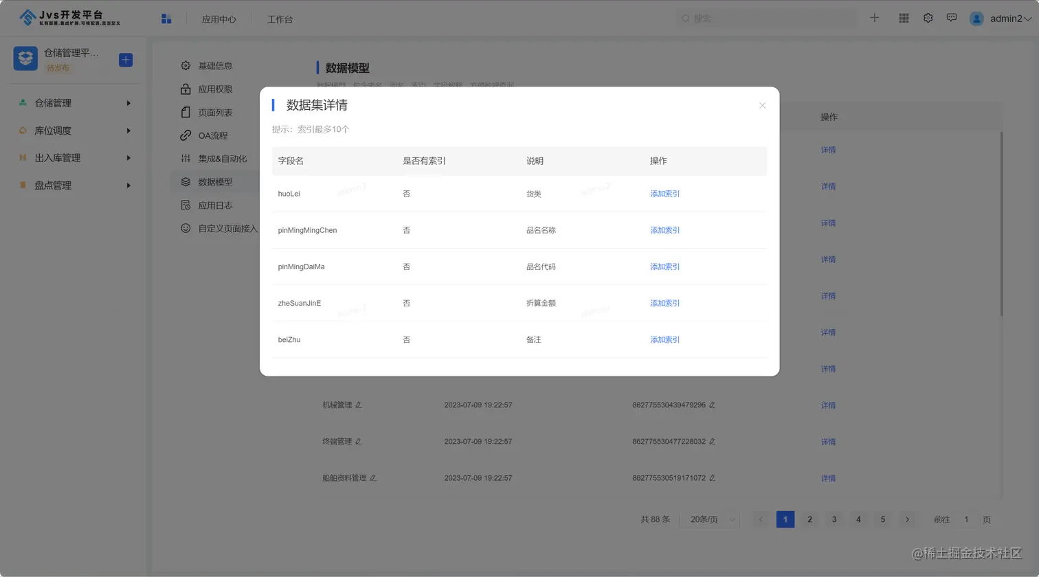 点击详情,将展示该数据模型的具体表结构,可以点击具体字段添加索引。