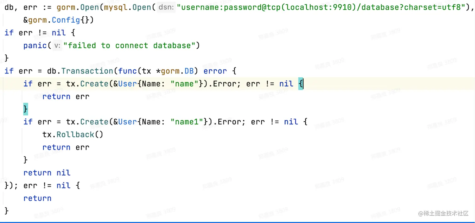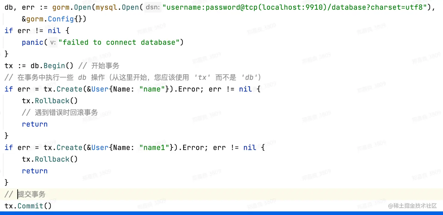 使用db.Begin()开启事务,即tx:=db.Begin(),之后的操作都是使用tx操作而不是使用db,在关键步骤记得要判断异常检测添加回滚(tx.Rollback()),所有操作添加完后记得提交事务(tx.Commit())。如下所示: